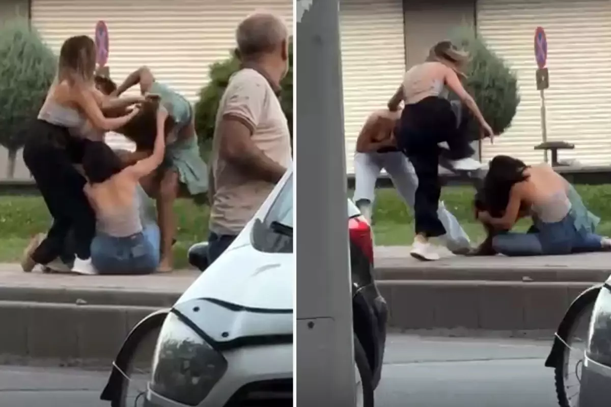 Bir türlü ayrılmayan bayanları etraftaki erkekler zahmetle ayırdı. O anlar, cep telefonu kamerasıyla kaydedildi.