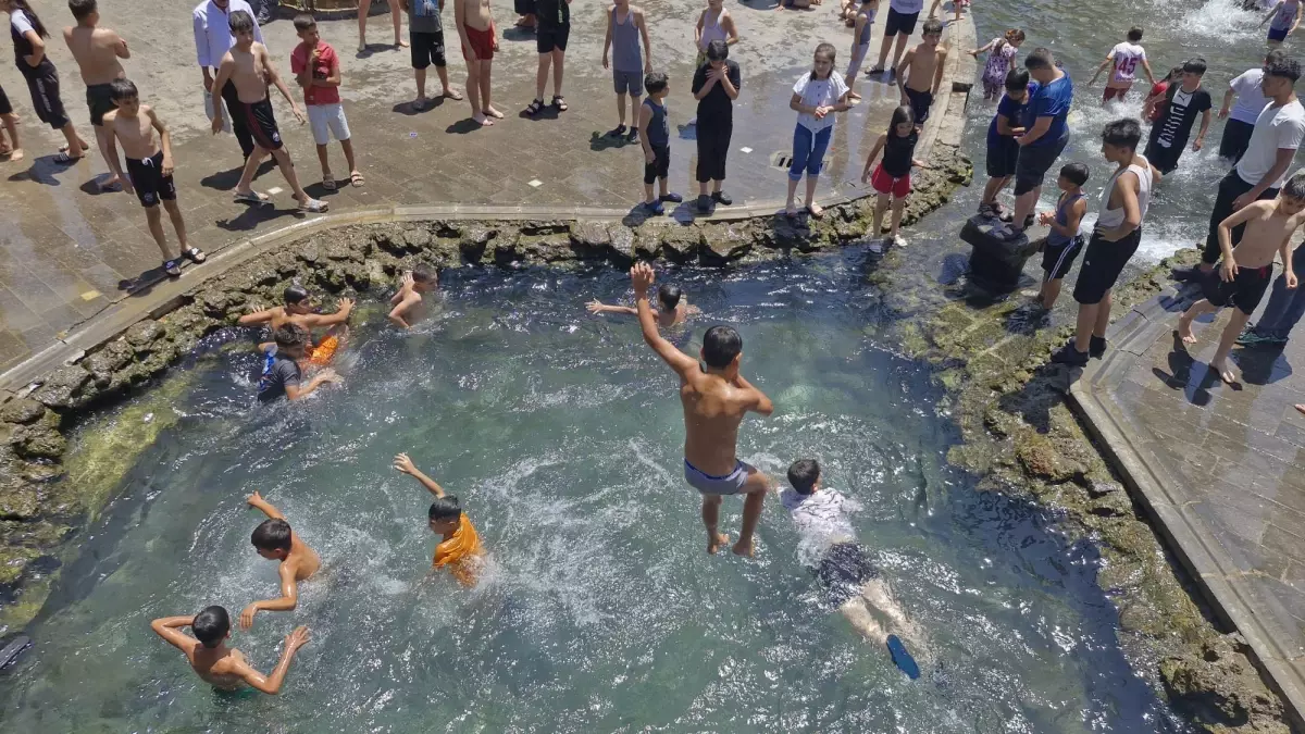 DİYARBAKIR’da hava sıcaklıklarının artmasıyla birlikte çocuklar, tehlikeli ve yasak olmasına karşın tarihi Anzele Parkı’nın süs havuzunda serinledi.