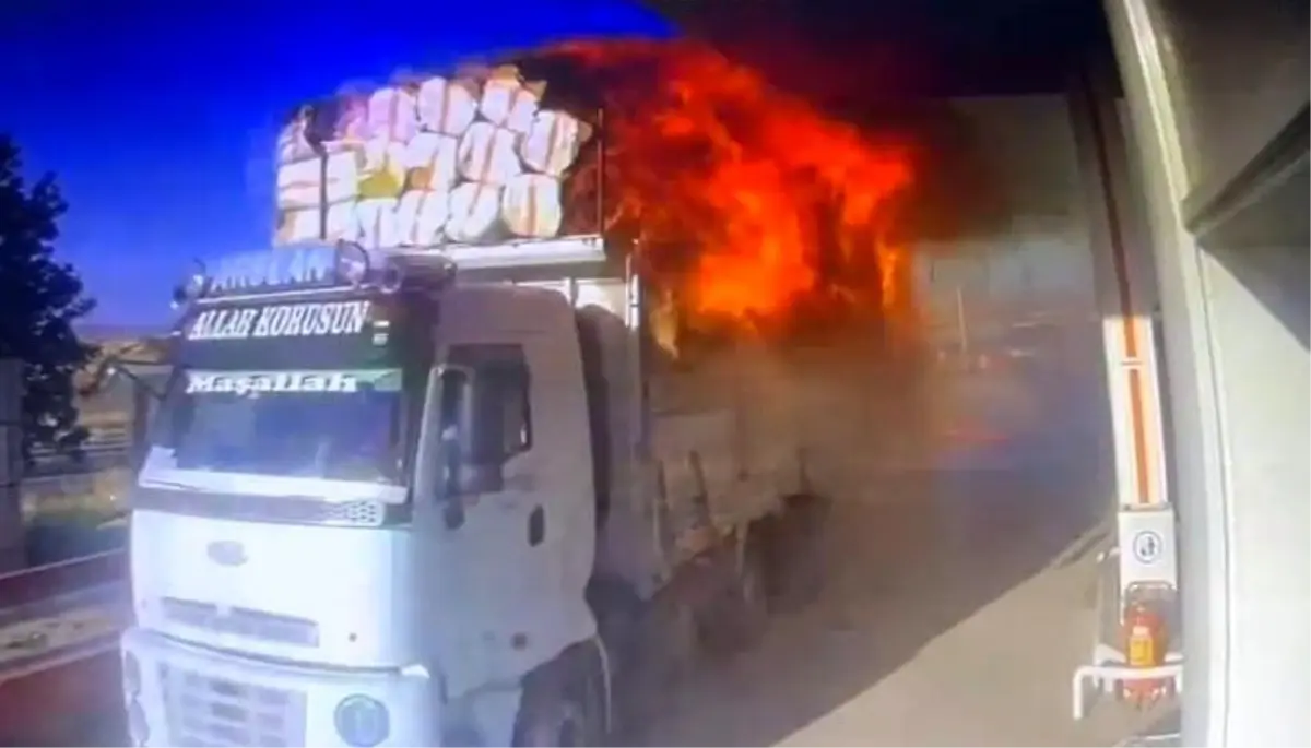 Kasımlı Mahallesi’nde dün, kamyona yüklü saman balyalarından alevler yükseldiğini gören şoför, aracı yol üzerindeki akaryakıt istasyonunun olduğu alana çekti. Şoför, daha sonra kamyonu tarlada inançlı bir alana sürdü.